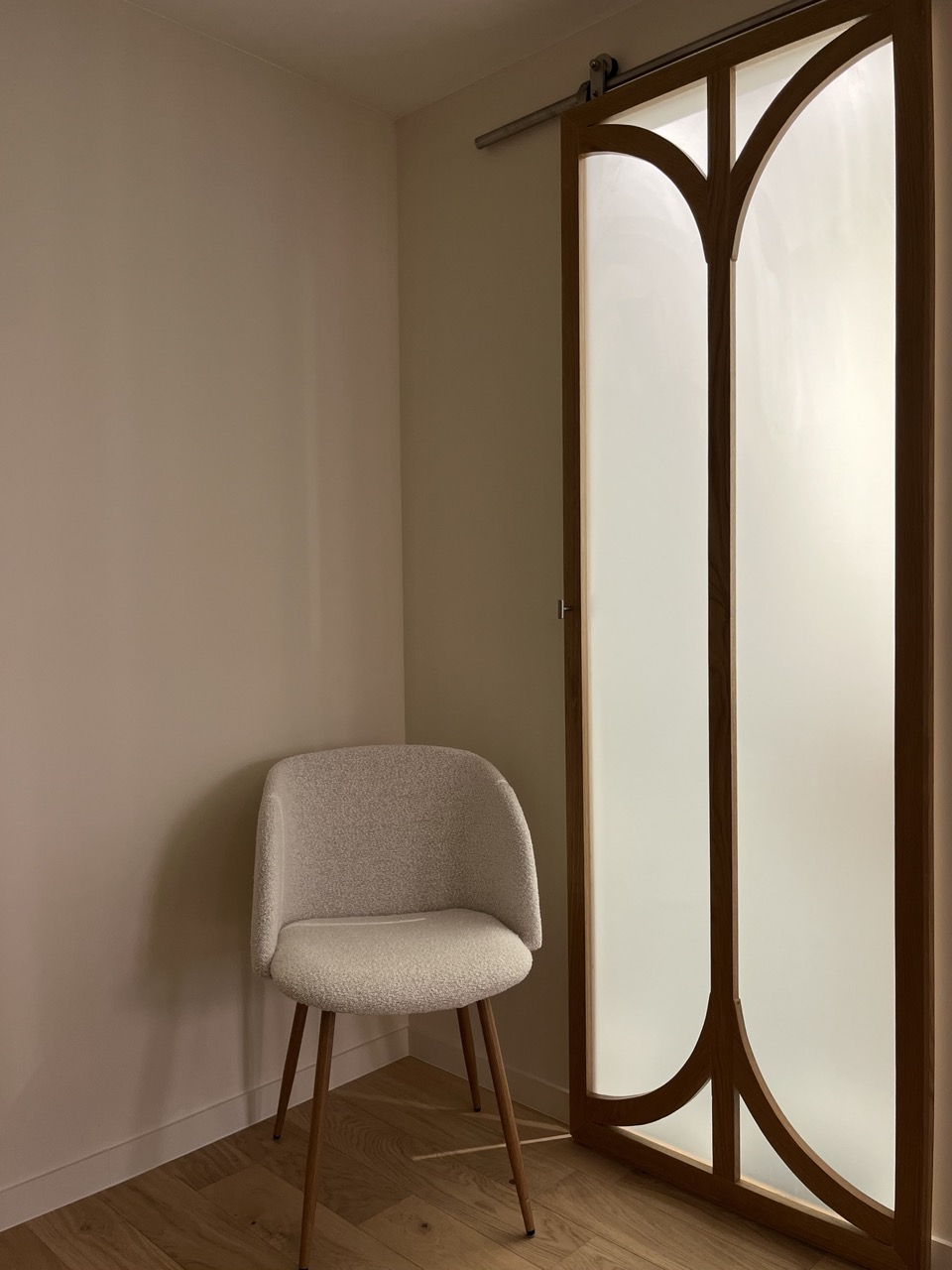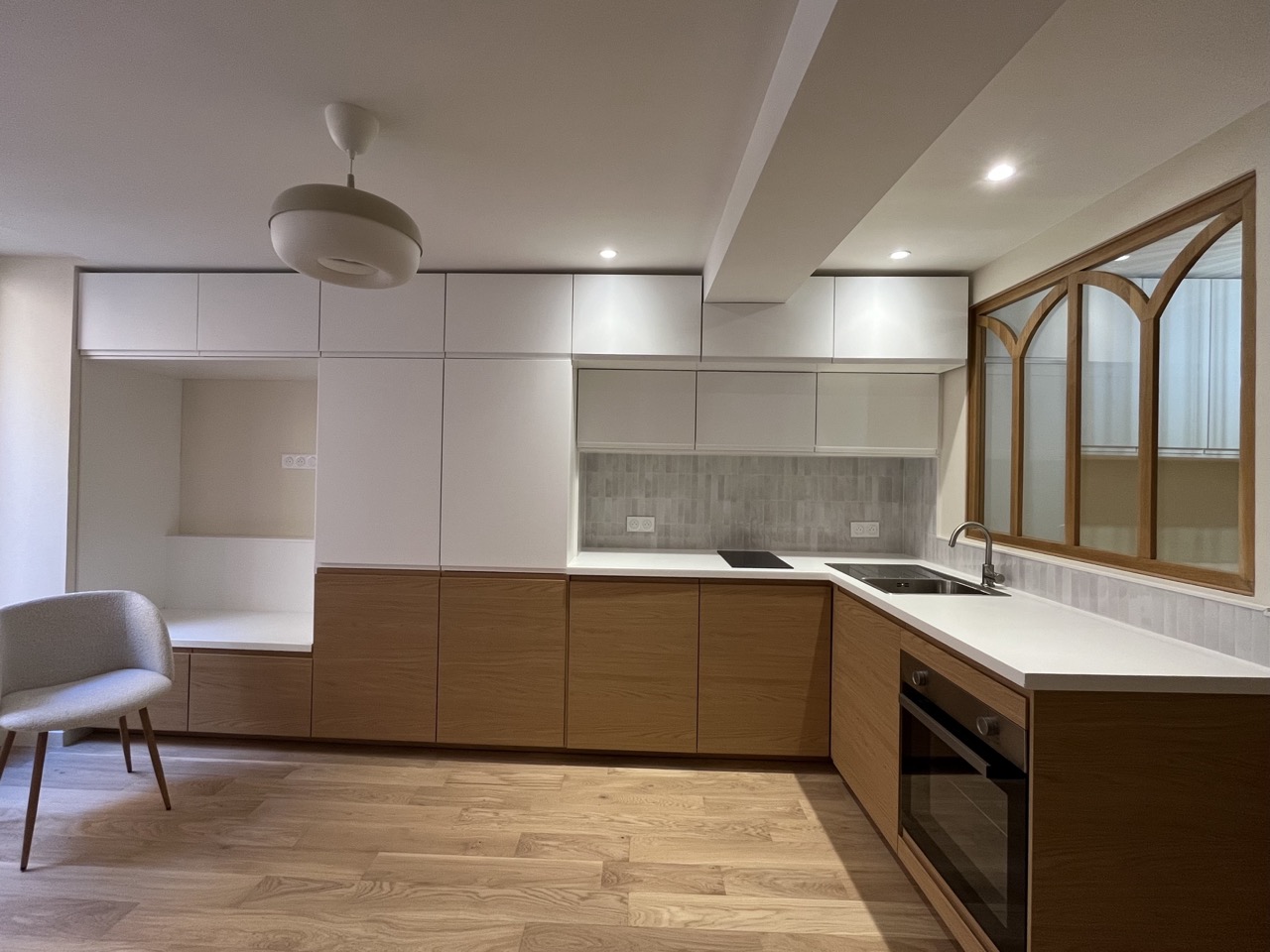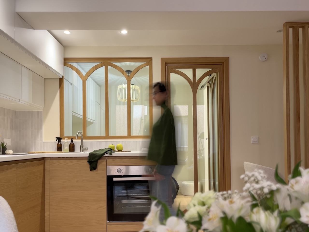 Résultat : Transformé avec soin, cet appartement est devenu un véritable cocon chaleureux et accueillant, offrant tout le confort dont on peut rêver. Pour maximiser la luminosité, une élégante verrière en bois inspirée du style Art Déco a été installée entre le séjour, la cuisine, et la chambre. Ce choix a été renforcé par des portes entièrement vitrées, diffusant la lumière naturelle dans tout l’espace.