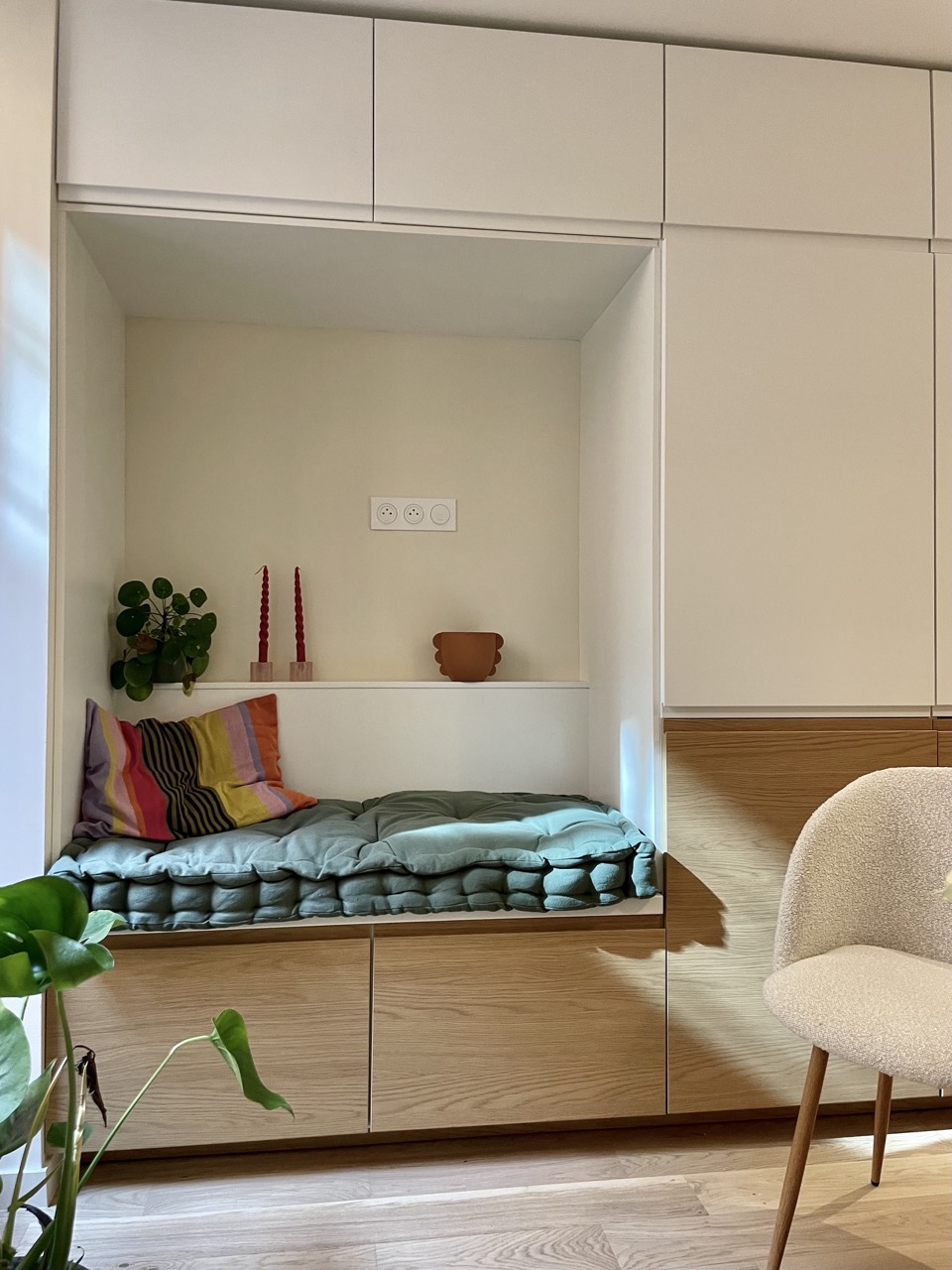 L’agencement a également été repensé pour plus de praticité et de confort. La salle de douche a été déplacée dans la chambre, permettant ainsi de libérer un espace pour un coin buanderie où le lave-linge a trouvé sa place. Un pan de mur entier a été optimisé avec des rangements ingénieux : une banquette intégrée côté salon, de grandes armoires, une cuisine moderne et compacte, ainsi qu’un dressing fonctionnel dans la chambre.